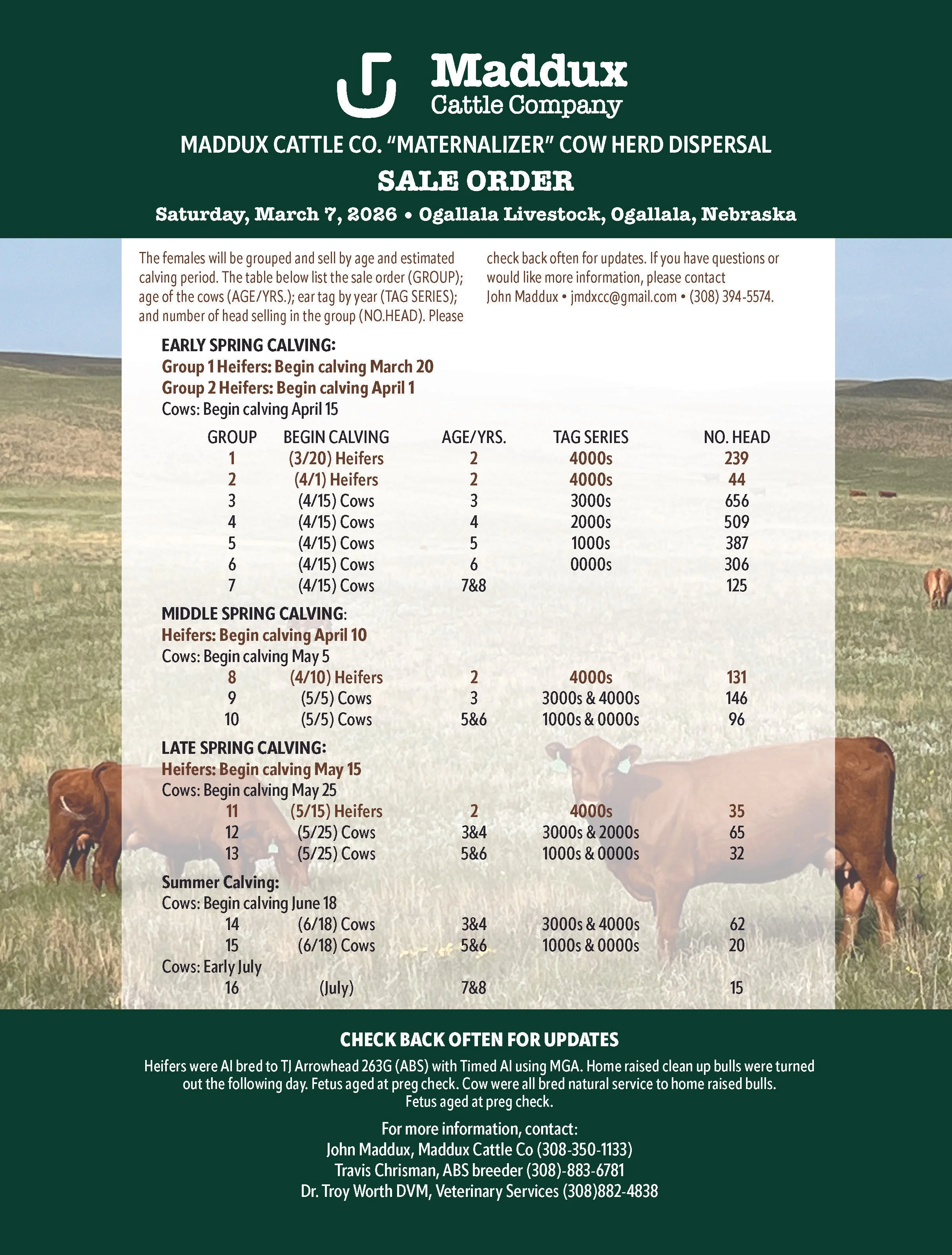 The females will be grouped and sell by age and estimated calving period. The table below list the sale order (GROUP); age of the cows (AGE/YRS.); ear tag by year (TAG SERIES); and number of head selling in the group (NO. HEAD). Please check back often for updates. If you have questions or would like more information, please contact John Maddux • jmdxcc@gmail.com • (308) 394-5574.